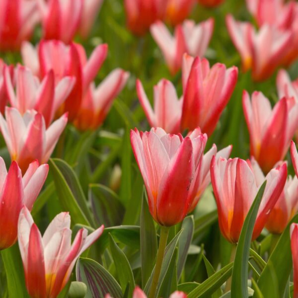 Heart’s Delight tulips are rockery or dwarf tulips, the flower has six pointed petals when open they almost look like water-lilies. The base of the flower is golden with carmine red edge with rosy white. The leaves are striped burgundy and green. The overall effect is a great addition to any border or pot.