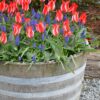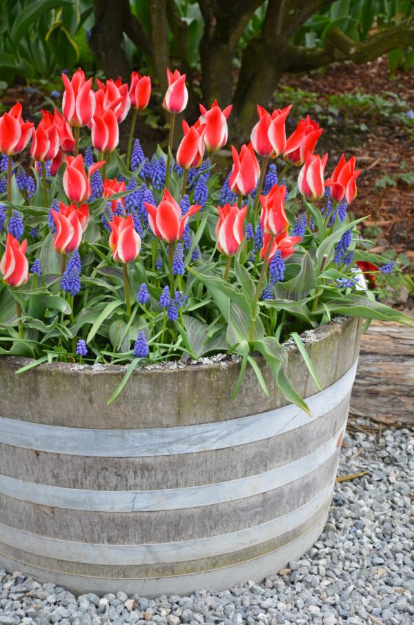 Dwarf Tulips – These Dwarf tulips are ideal for exposed sites where wind damage may be a problem. Perfect for Rockeries bedding out or growing in containers on the patio. Bright Red Flowers with White Strip,RHS award garden merit winner.